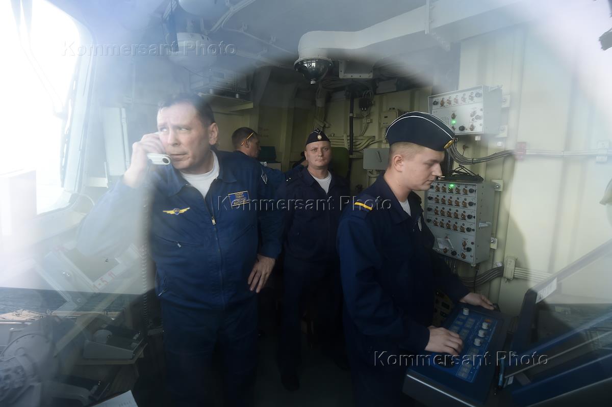 Экипажи вертолетов Морской авиации Черноморского флота провели тренировки по взлетам и посадкам на фрегат "Адмирал Макаров" в море. Пункт руководителя полетов на вертолетной палубе фрегата.
