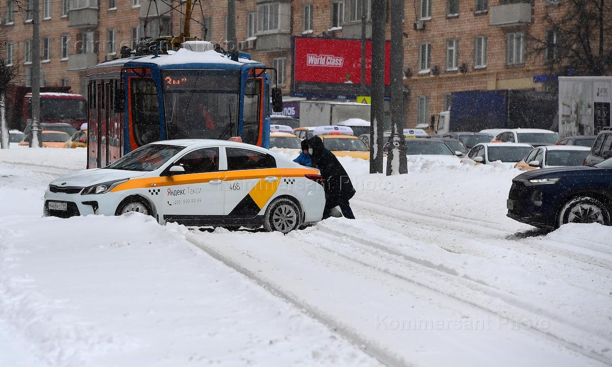 Последствия снегопада в городе. Жанровая фотография. Застрявший автомобиль "Яндекс. Такси" на рельсах трамвая.