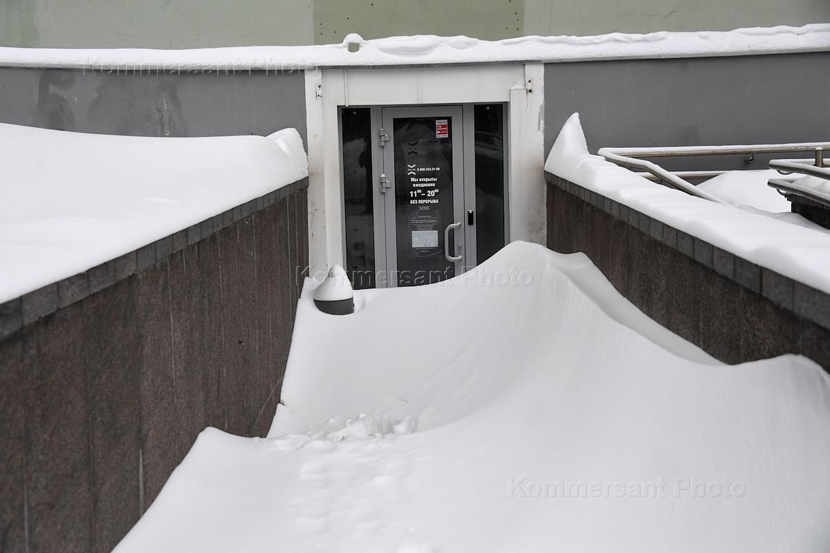 Виды Москвы после снегопада. Жанровая фотография. Занесенный снегом вход в магазин.