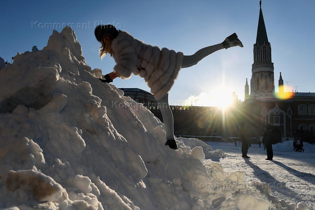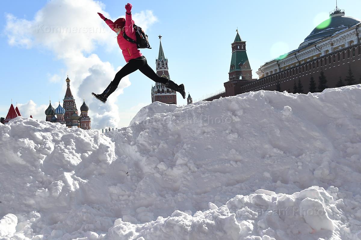Жанровая фотография. Девушка прыгает на огромном сугробе на Красной площади.