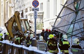 Обрушение строительных лесов в Лубянском проезде. Строительные леса, установленные на фасаде пятиэтажного административного здания, находящегося на реконструкции, упали на временный пешеходный переход. Работа сотрудников пожарно-спасательных подразделений на месте происшествия.