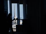 Обрушение строительных лесов в Лубянском проезде. Строительные леса, установленные на фасаде пятиэтажного административного здания, находящегося на реконструкции, упали на временный пешеходный переход. Вид на высотный жилой дом на Котельнической набережной от места обрушения.