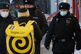 Обрушение строительных лесов в Лубянском проезде. Строительные леса, установленные на фасаде пятиэтажного административного здания, находящегося на реконструкции, упали на временный пешеходный переход. Сотрудники полиции и курьер службы доставки "Яндекс. Еда" на месте происшествия.