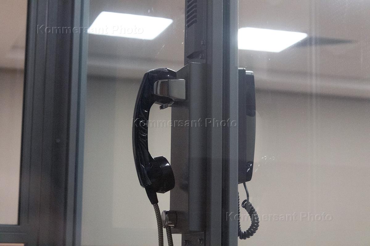 Жанровая фотография. Телефонная трубка для переговоров в стеклянном "аквариуме" в зале суда.