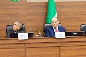Совещание судей Республики Татарстан по итогам работы за 2020 год в новом здании Советского районного суда города Казани. Президент Республики Татарстан Рустам Минниханов (слева) и председатель Верховного суда Республики Татарстан Ильгиз Гилазов (справа) во время совещания.