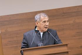Совещание судей Республики Татарстан по итогам работы за 2020 год в новом здании Советского районного суда города Казани. Президент Республики Татарстан Рустам Минниханов во время совещания.