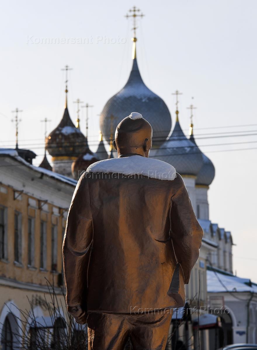 Виды Ростова Великого. Жанровая фотография. Памятник Владимиру Ленину в снегу на улице 50 лет Октября.