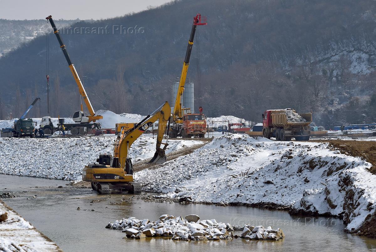 Строительство водозабора на реке Бельбек, по которому будет поступать вода в городские водопроводные сети Севастополя. Губернатор Севастополя Михаил Развожаев во время осмотра хода строительства.
