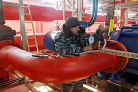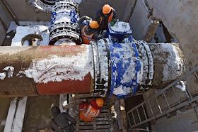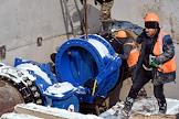 Строительство водозабора на реке Бельбек, по которому будет поступать вода в городские водопроводные сети Севастополя. Губернатор Севастополя Михаил Развожаев (в центре) во время осмотра хода строительства.