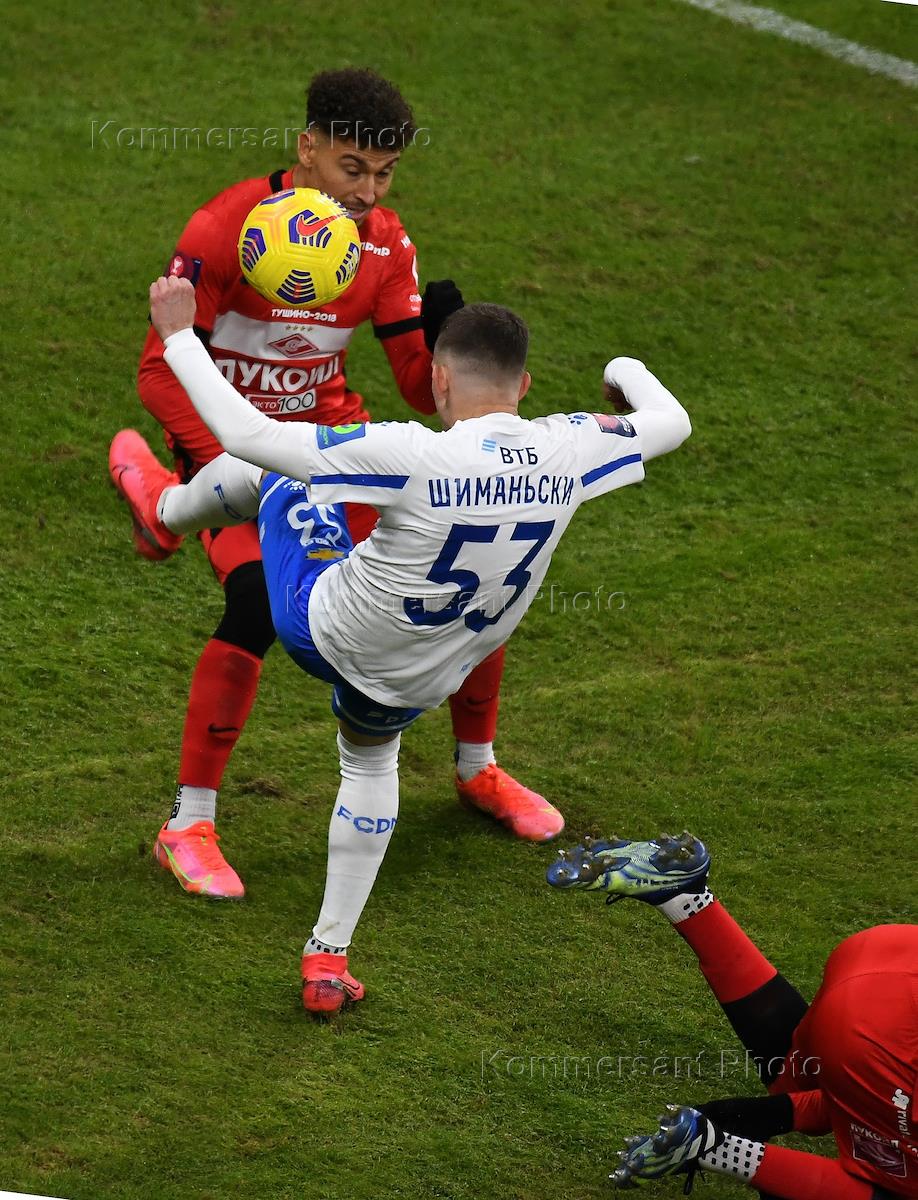 Бетсити Кубок России 1/8 финала по футболу. Матч между командами "Динамо" (Москва) - "Спартак" (Москва) на стадионе "ВТБ Арена - Центральный стадион Динамо им. Льва Яшина". Игрок команды "Динамо" Себастьян Шиманьски (слева) и игрок команды "Спартак" Йоррит Хендрикс (справа) во время матча.