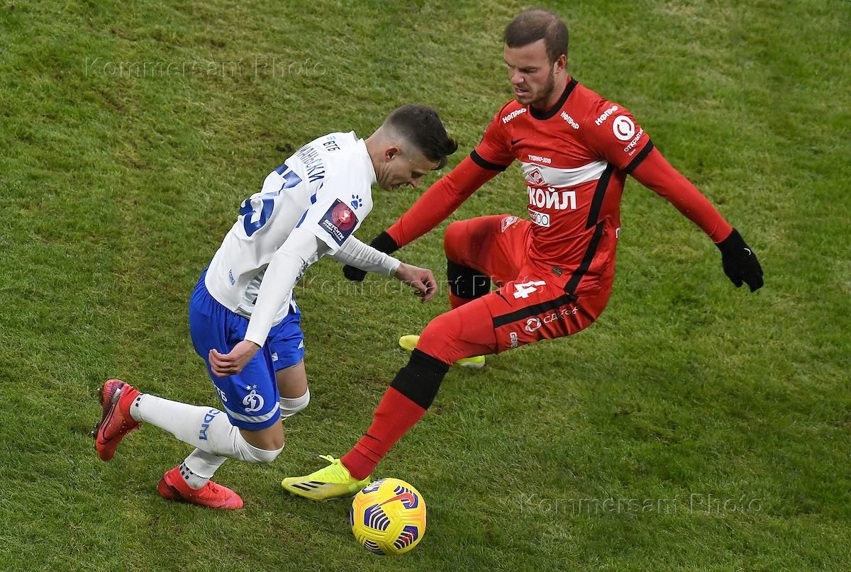 Бетсити Кубок России 1/8 финала по футболу. Матч между командами "Динамо" (Москва) - "Спартак" (Москва) на стадионе "ВТБ Арена - Центральный стадион Динамо им. Льва Яшина". Игрок команды "Динамо" Константин Тюкавин (слева) и игрок команды "Спартак" Самуэль Жиго (справа) во время матча.