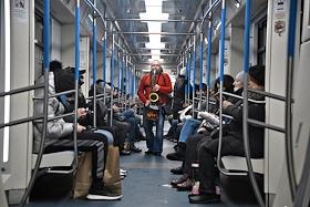Московский метрополитен. Жанровая фотография. Музыкант в вагоне поезда метро.