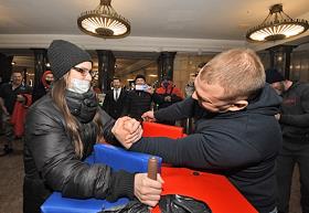 Московский метрополитен совместно с Федерацией силового экстрима России при поддержке РосМолСпорта Московской области провели спортивный день для пассажиров метро на станции "Курская". Для бесплатного доступа в метро работает стойка "Победите и проходите", на ней можно было посоревноваться в армреслинге с участником сборной России по силовому экстриму.