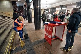 Московский метрополитен. Жанровая фотография. Автомат с антисептиком на станции метро "Курская".