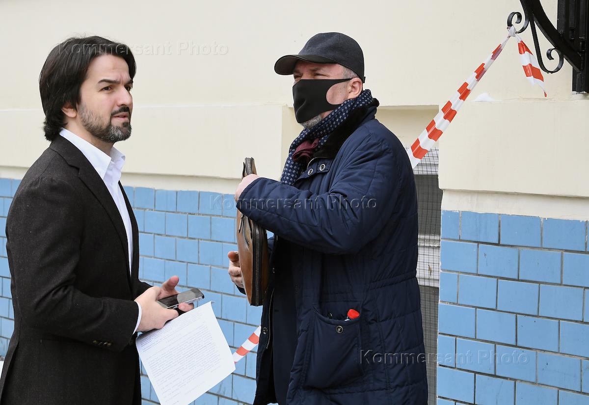 Заседание суда о ходатайстве следствия о продлении меры пресечения в виде запрета определённых действий в отношении аудитора Счетной палаты России Михаила Меня, обвиняемого в растрате 700 миллионов рублей на посту губернатора Ивановской области в 2011 году, в Басманном районном суде. Аудитор Счетной палаты России Михаил Мень (слева) и адвокат Мурад Мусаев (справа) перед началом заседания суда.
