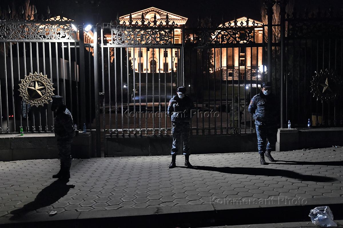 Политическая ситуация в Ереване. Сотрудники полиции у здания Национального собрания Армении в Еревaне. После заявления премьер-министра Николы Пашиняна, что причиной потери Карабаха стало плохое российское вооружение, Генеральный штаб Министерства обороны Армении поставил ультиматум премьер-министру с требованием немедленно уйти в отставку.
