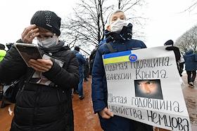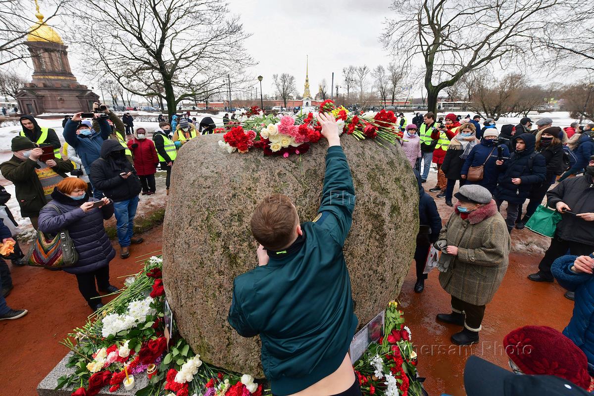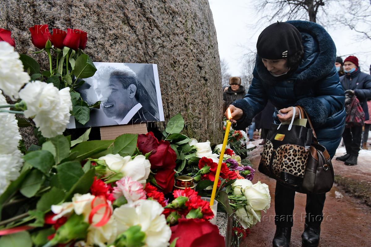 Мероприятия, посвященные памяти политика Бориса Немцова, в Санкт-Петербурге. Акция памяти политика Бориса Немцова у Соловецкого камня. Сопредседатель партии "Парнас" Борис Немцов был застрелен на Большом Москворецком мосту в Москве 27 февраля 2015 года.