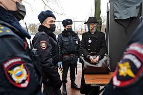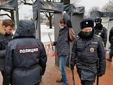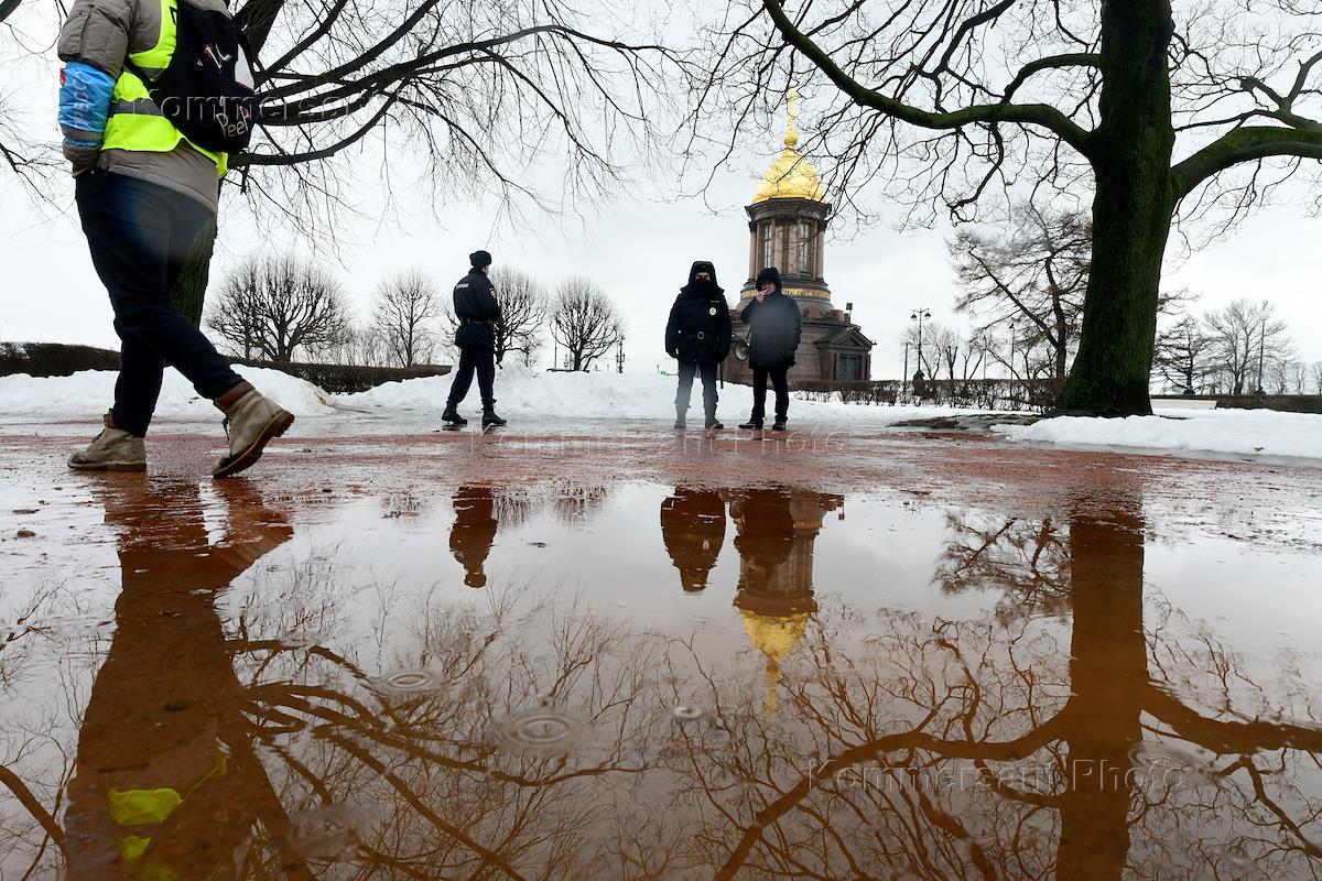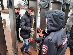 Мероприятия, посвященные памяти политика Бориса Немцова, в Санкт-Петербурге. Акция памяти политика Бориса Немцова у Соловецкого камня. Сопредседатель партии "Парнас" Борис Немцов был застрелен на Большом Москворецком мосту в Москве 27 февраля 2015 года. Сотрудники полиции во время досмотра участников акции.