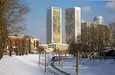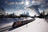 Виды Москвы. Жанровая фотография. Электропоезд "Ласточка" во время движения в районе Московского международного делового центра (ММДЦ) "Москва-сити".
