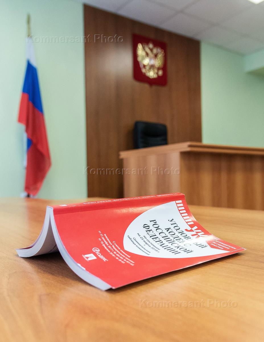 Жанровая фотография. Зал судебных заседаний. Уголовный кодекс Российской Федерации на столе.