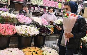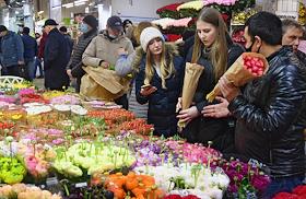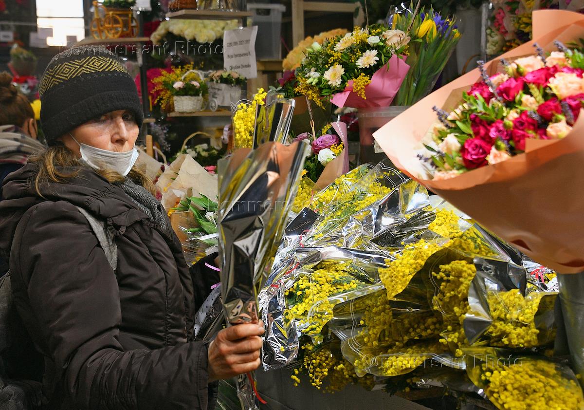 Торговля цветами к 8 марта на Рижском цветочном рынке.