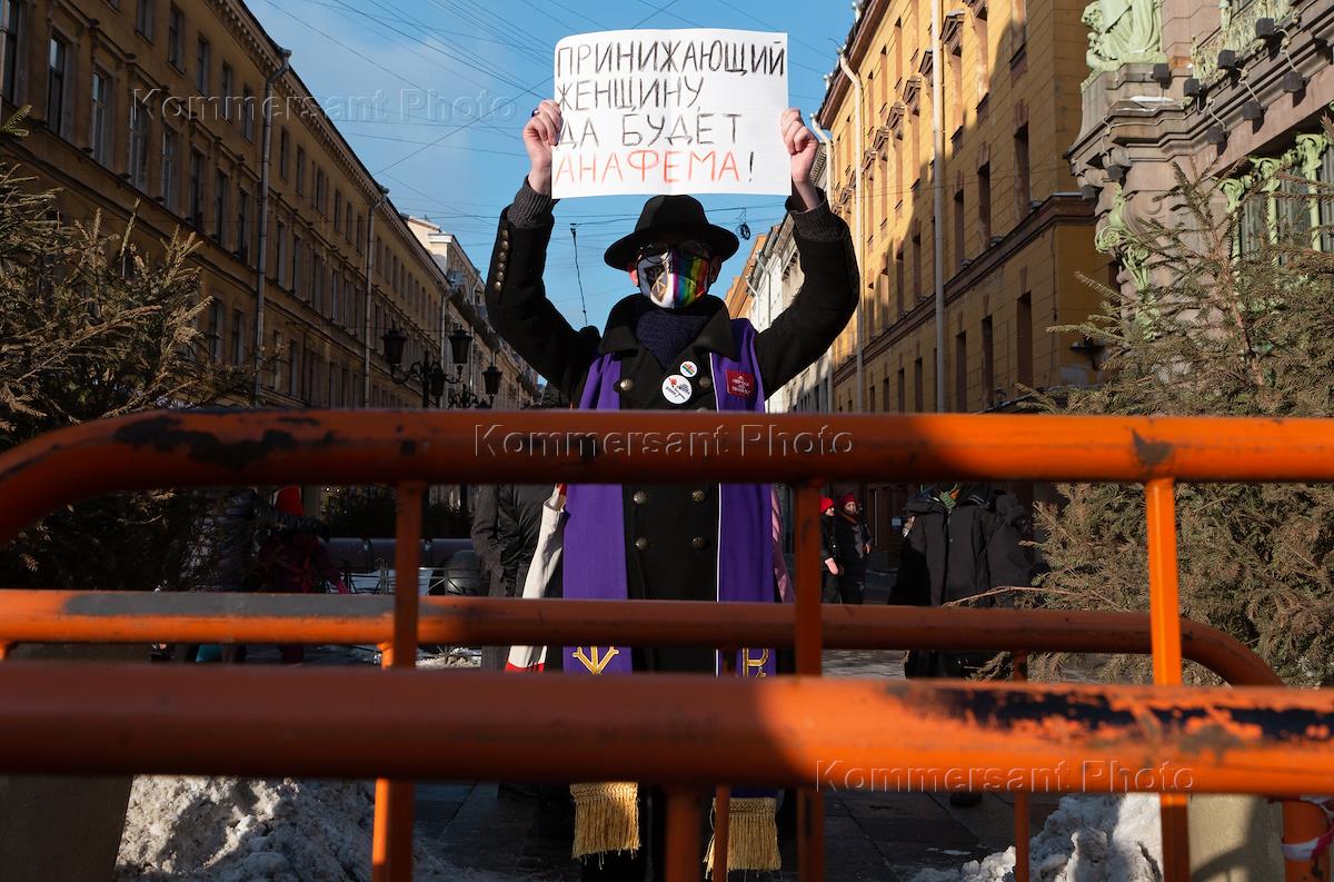 Участница одиночного пикета на Малой Садовой, приуроченная к международному женскому дню 8 марта.