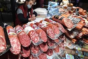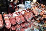 Виды Москвы. Жанровая фотография. Москворецкий рынок. Прилавок с колбасными изделиями.