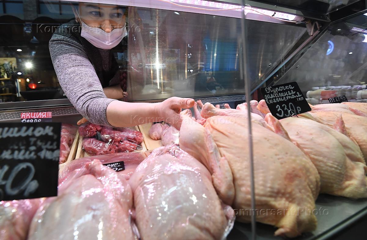 Виды Москвы. Жанровая фотография. Москворецкий рынок. Продавец в медицинской защитной маске в мясном ряду.