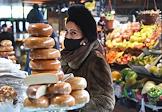 Виды Москвы. Жанровая фотография. Москворецкий рынок. Продавец в медицинской маске, фартуке с бейджиком у прилавка.