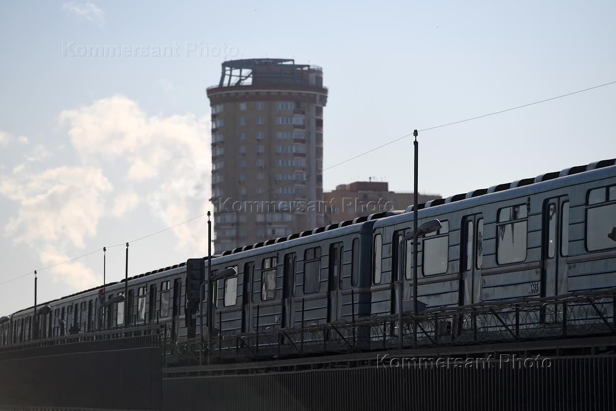 Виды Москвы. Жанровая фотография. Поезд метро на Замоскворецкой линии на фоне жилого многоэтажного дома.