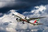 Жанровая фотография. Самолет авиакомпании Emirates в небе над аэропортом Пулково.