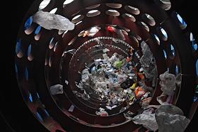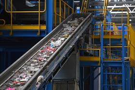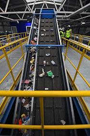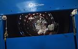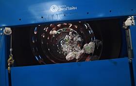 Работа комплекса по переработке отходов (КПО) "Восток". Комплекс разработан и построен компанией "Эко-Лайн". Предприятие входит в перечень объектов национального проекта "Экология". Жанровая фотография. Баллистический сепаратор, отделяющий легкий плоский пластик от объемного тяжелого.
