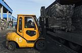 Работа комплекса по переработке отходов (КПО) "Восток". Комплекс разработан и построен компанией "Эко-Лайн". Предприятие входит в перечень объектов национального проекта "Экология". Жанровая фотография. Погрузка прессованного мусора.