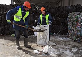Работа комплекса по переработке отходов (КПО) "Восток". Комплекс разработан и построен компанией "Эко-Лайн". Предприятие входит в перечень объектов национального проекта "Экология". Жанровая фотография. Сотрудники во время уборки территории.