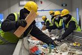 Работа комплекса по переработке отходов (КПО) "Восток". Комплекс разработан и построен компанией "Эко-Лайн". Предприятие входит в перечень объектов национального проекта "Экология". Жанровая фотография. Сотрудники во время работы в сортировочном цехе.