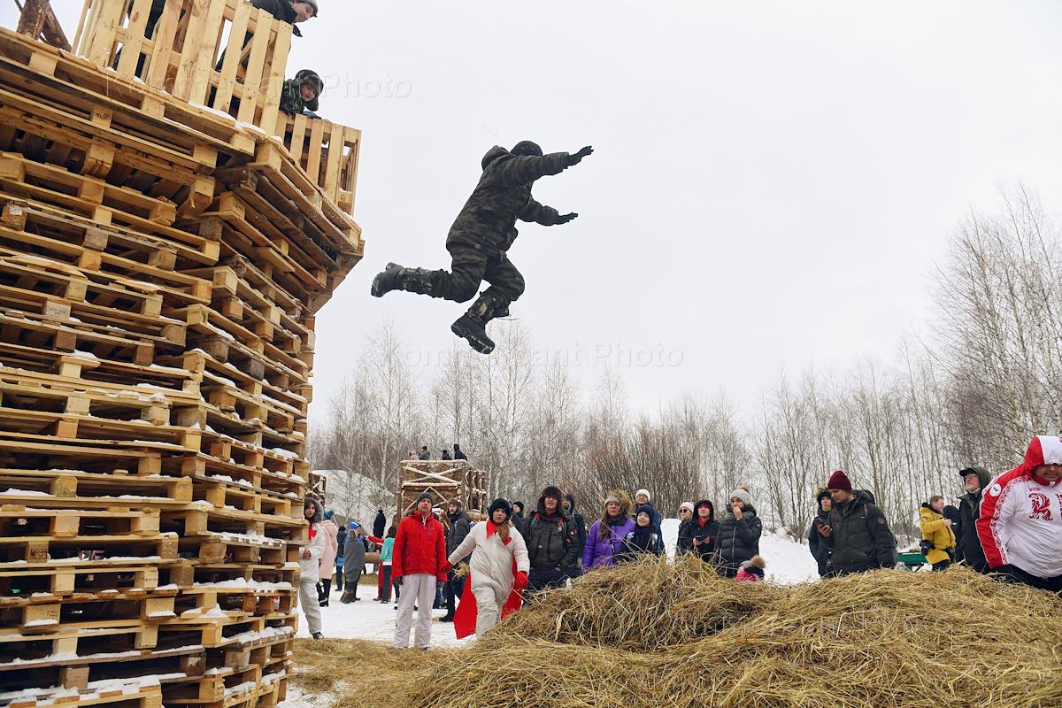 Празднование "Широкой Масленицы" в деревне Никола-Ленивец. Соревнование по прыжкам с высоты в сено.