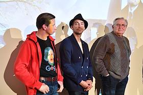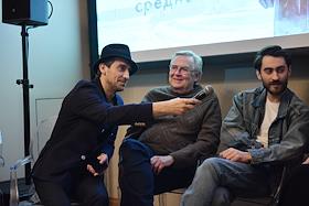 Премьера сериала "Вампиры средней полосы" режиссера Антона Маслова в концертном зале "Башмет центр". Слева направо: рактеры Артем Ткаченко Глеб Калюжный и Юрий Стоянов на премьере.