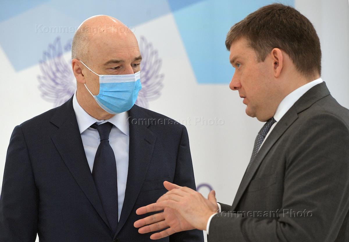 Расширенное заседание Коллегии Федерального казначейства. Министр финансов России Антон Силуанов (слева) и руководитель Федерального казначейства России Роман Артюхин (справа) после заседания.