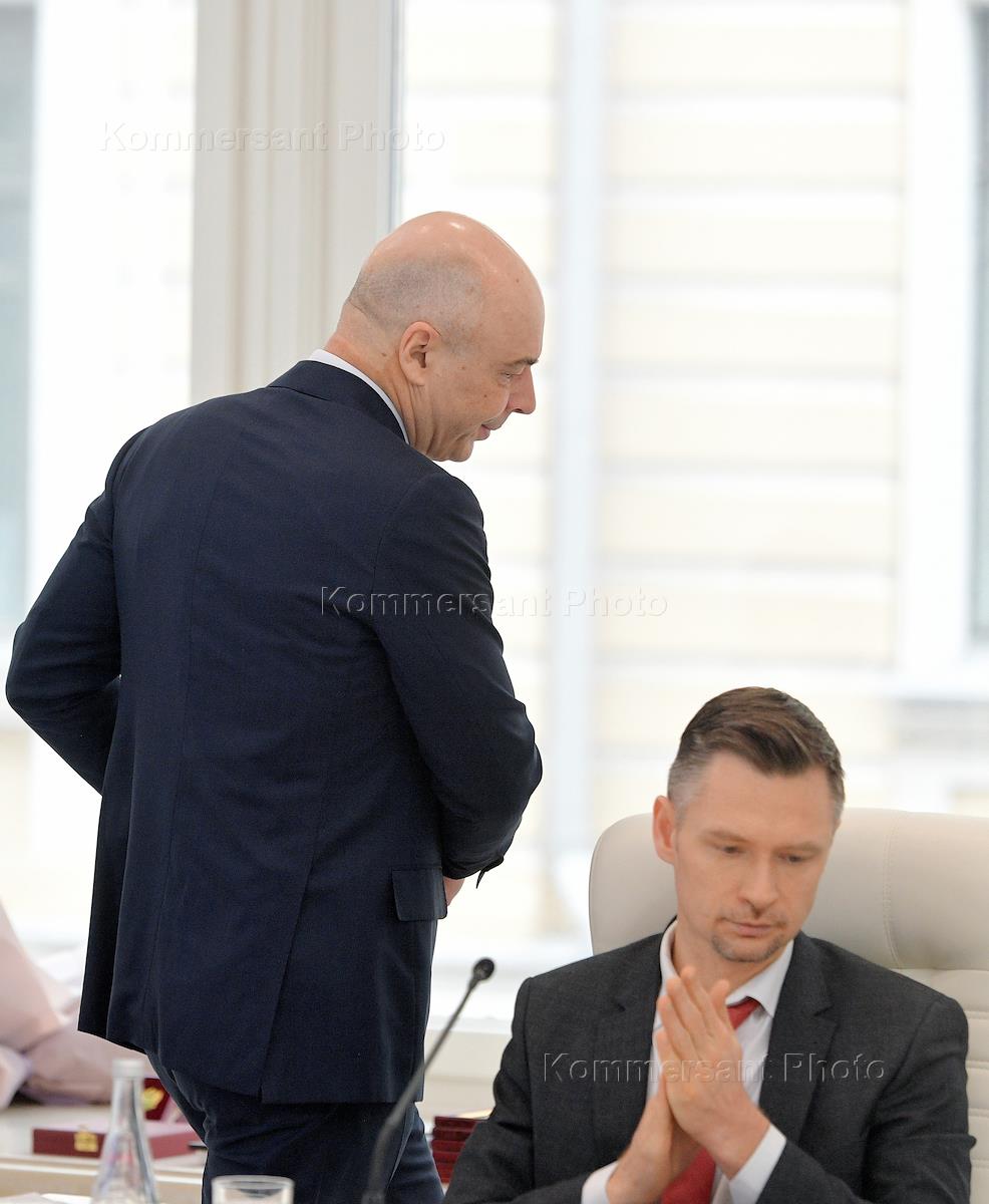 Расширенное заседание Коллегии Федерального казначейства. Руководитель Федерального агентства по управлению государственным имуществом (Росимущество) Вадим Яковенко (справа) и министр финансов России Антон Силуанов (слева) во время заседания.