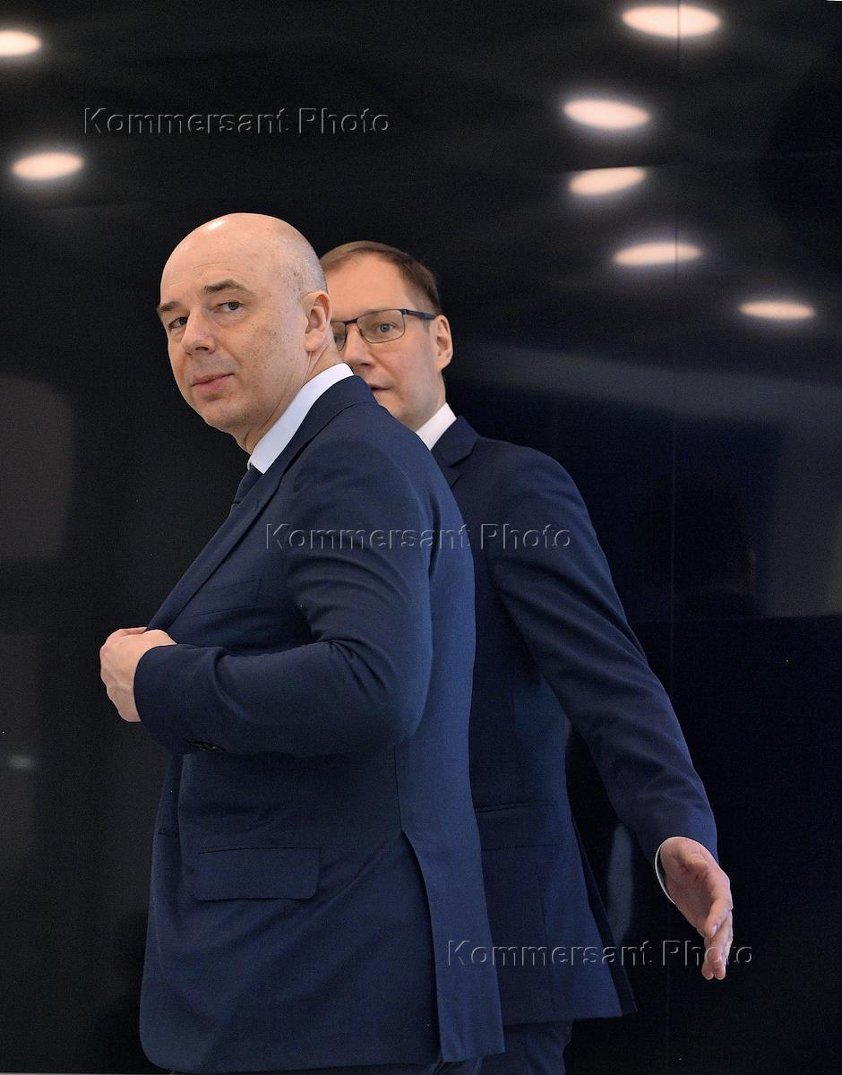 Расширенное заседание Коллегии Федерального казначейства. Министр финансов России Антон Силуанов (слева) и руководитель Федерального казначейства России Роман Артюхин (справа) после заседания.
