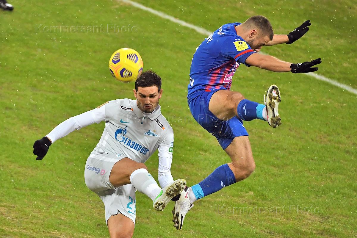 Российская Премьер-Лига (РПЛ). Тинькофф - Чемпионат России по футболу 2020/2021. 23-й тур. Матч между командами ЦСКА (Москва) - "Зенит" (Санкт-Петербург) на стадионе "ВЭБ Арена". Игрок команды ЦСКА Никола Влашич (справа) и игрок команды "Зенит" Магомед Оздоев (слева) во время матча.
