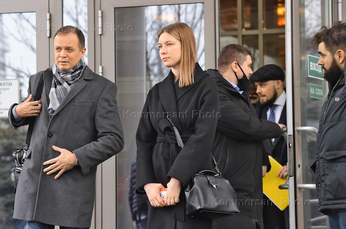 Рассмотрение апелляционной жалобы на решение Лефортовского суда Москвы о продлении ареста советнику главы "Роскосмоса" по информационной политике, бывшему журналисту газеты "Коммерсантъ" Ивану Сафронову, обвиняемому в государственной измене, в Московском городском суде. Адвокат Иван Павлов (слева) и журналист Ксения Миронова (в центре) после заседания суда.
