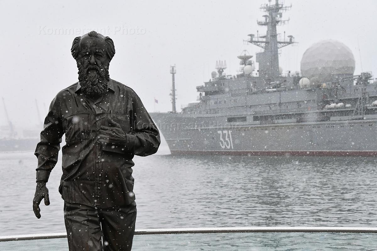 Виды Владивостока во время снегопада. Памятник писателю Александру Солженицыну на Корабельной набережной. Бухта Золотой Рог.