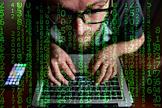 Жанровая фотография. Безопасность IT-систем. Отражение мужского силуэта на экране компьютера с зеленым цифровым фоном.