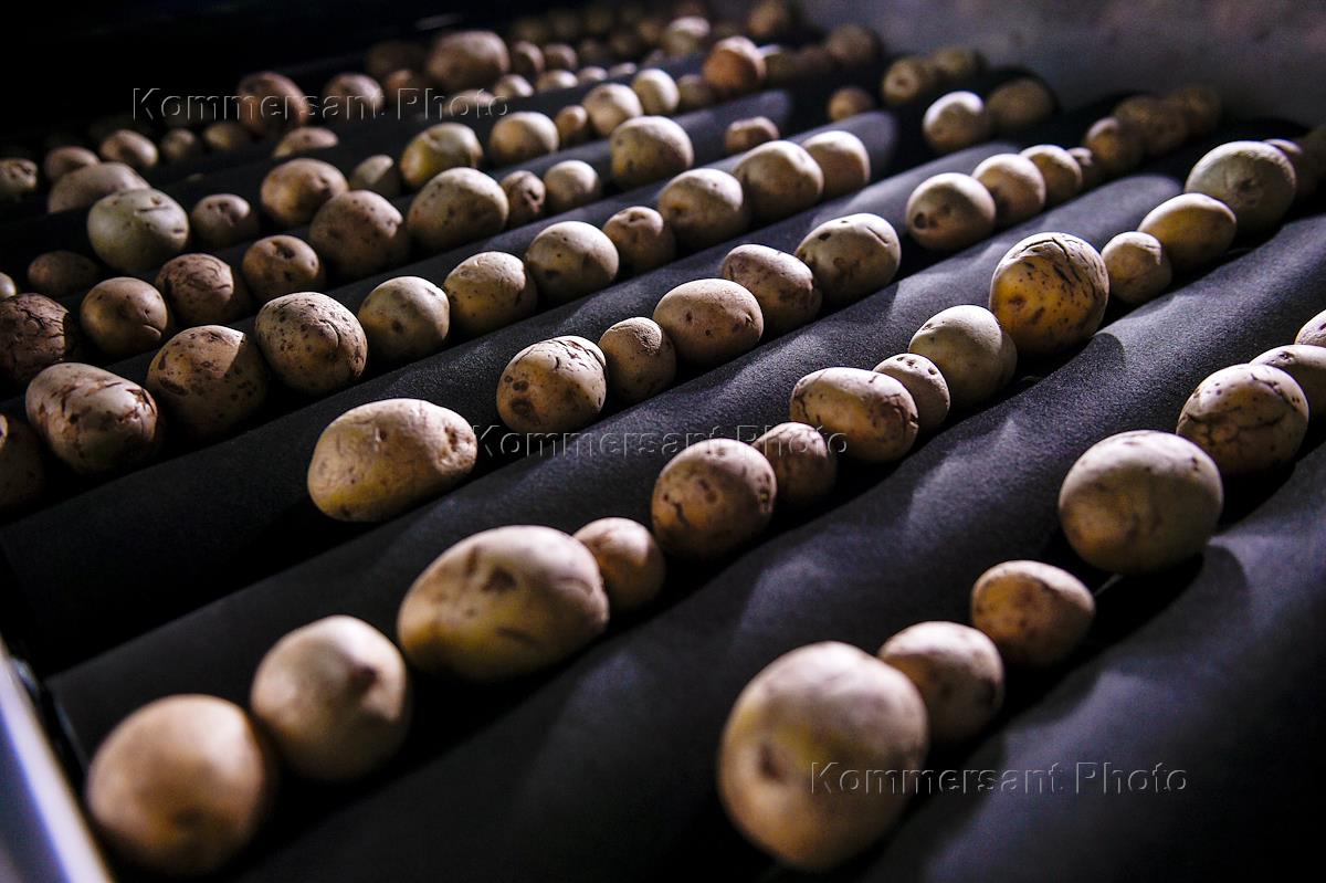Работа Оптово-распределительного центра (ОРЦ) "Русагромаркета" ("РусАгроМаркет) под Новосибирском. Жанровая фотография. Линия упаковки и фасовки картофеля.