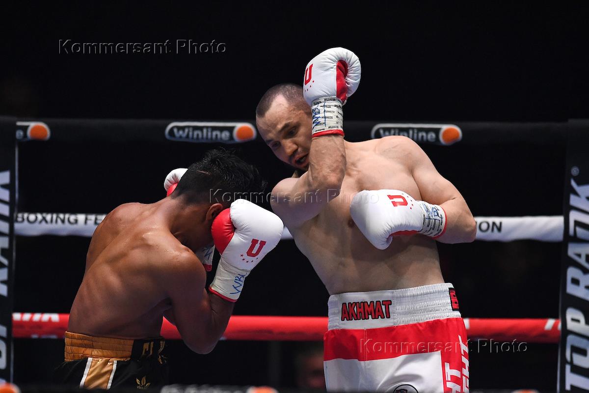Вечер профессионального бокса во дворце спорта "Мегаспорт". Российский спортсмен Павел Силягин (слева) и спортсмен из Узбекистана Азизбек Абдугофуров (справа) во время поединка.