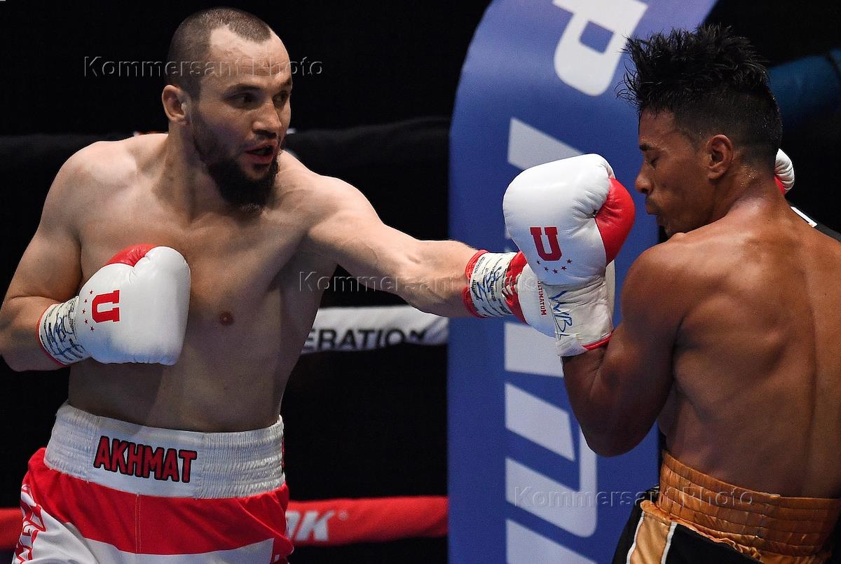 Вечер профессионального бокса во дворце спорта "Мегаспорт". Российский спортсмен Павел Силягин (слева) и спортсмен из Узбекистана Азизбек Абдугофуров (справа) во время поединка.