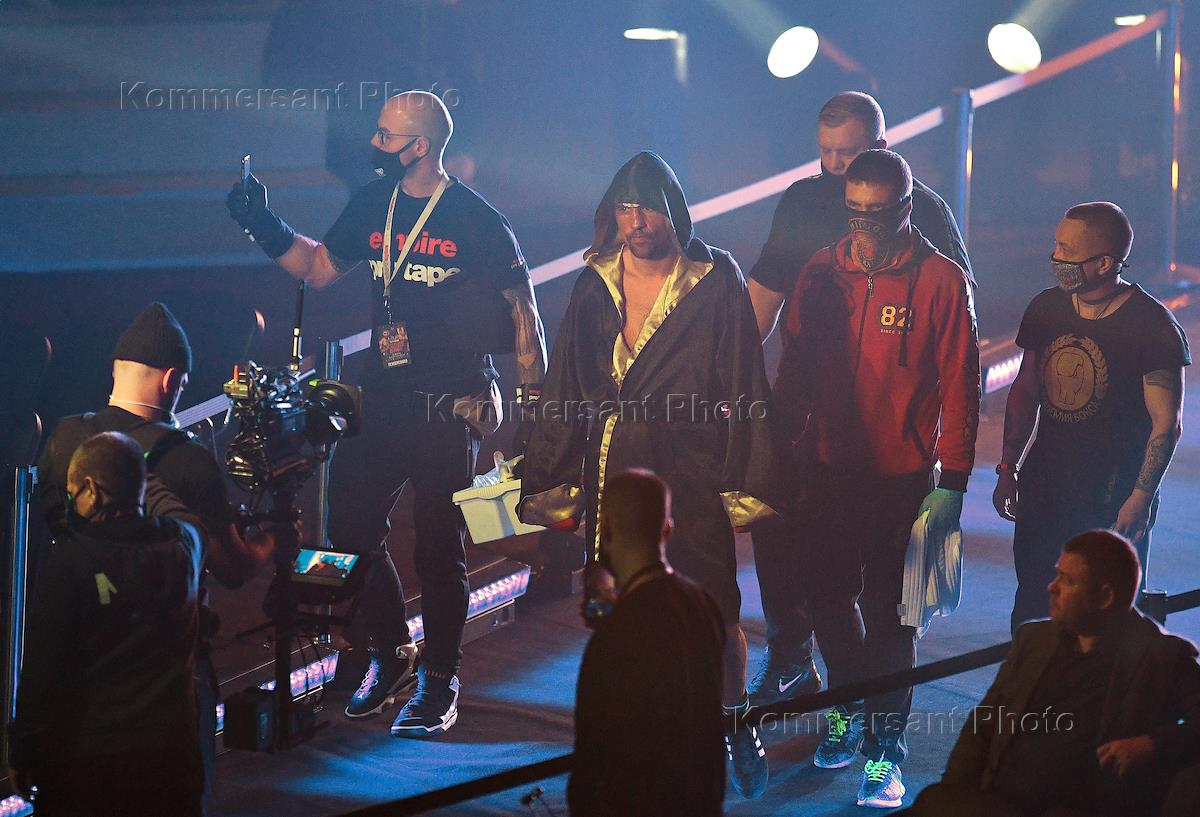 Вечер профессионального бокса во дворце спорта "Мегаспорт". Немецкий боксер Адам Дейнес (в центре) перед началом поединка с чемпионом мира по версиям WBC и IBF в полутяжелом весе Артуром Бетербиевым.