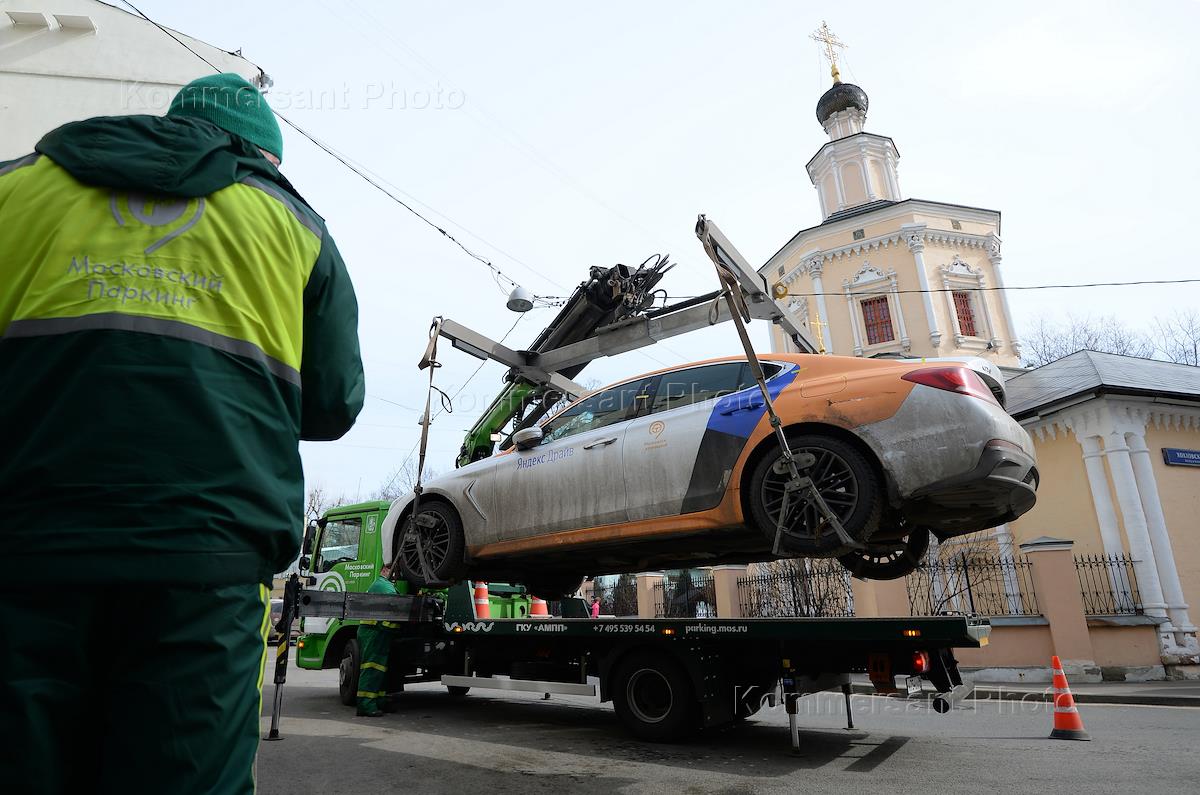 Жанровая фотография. Эвакуация неправильно припаркованного автомобиля каршеринговой компании "Яндекс. Драйв" на улице Ивановской горки.
