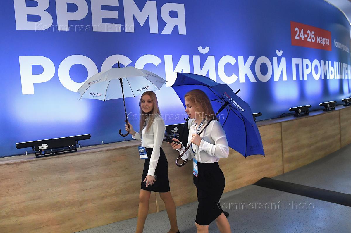 Всероссийский Форум-выставка "ГОСЗАКАЗ" на территории ВДНХ. Жанровая фотография. Сотрудницы с рекламными зонтами компании "Гостиндер" - первая соцсеть для бизнеса - во время работы выставки.